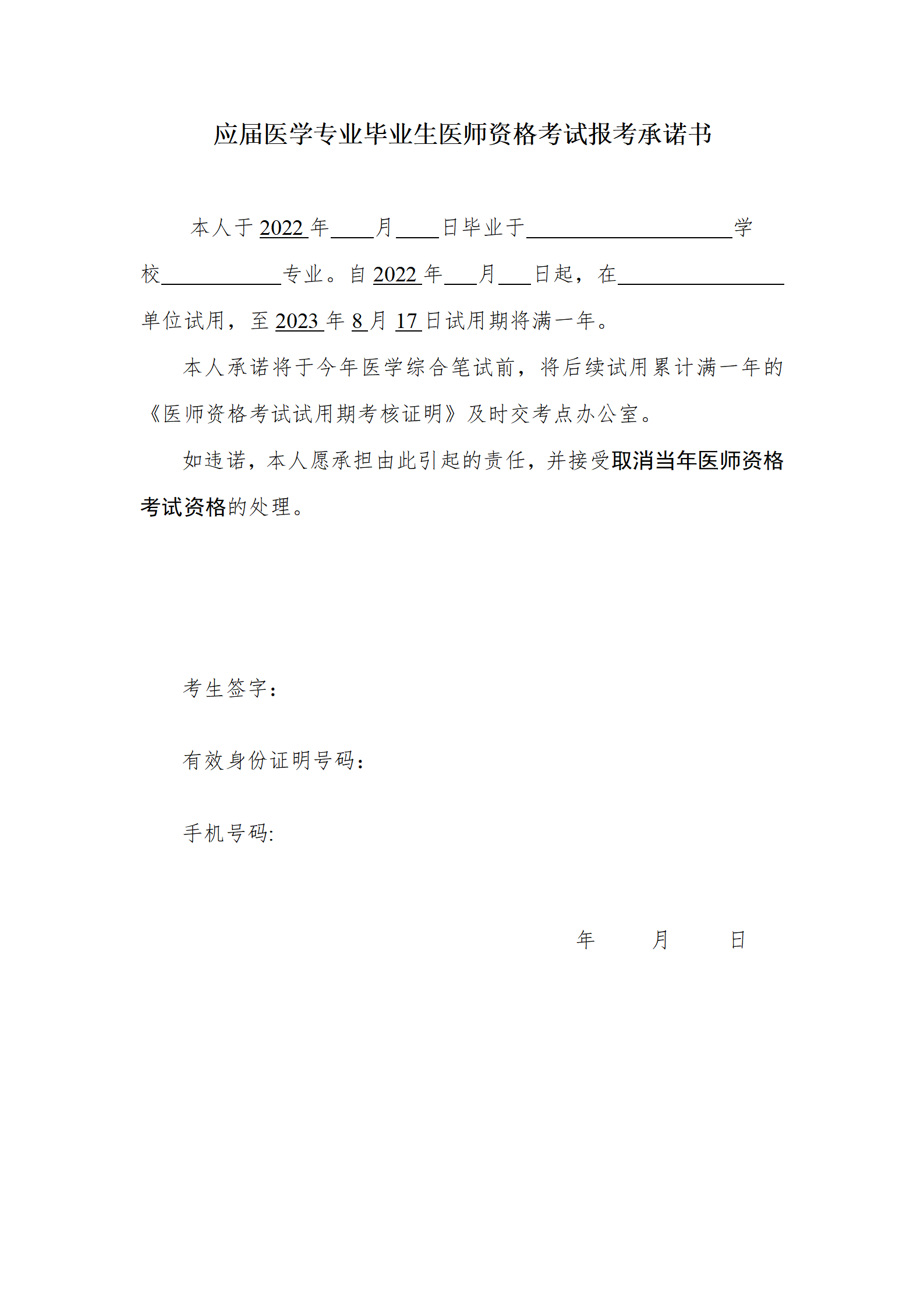 根據(jù)《杭州市蕭山區(qū)2023年醫(yī)師資格考試工作有關(guān)事項|報名安排|繳費|材料|現(xiàn)場確認通知》,醫(yī)學教育網(wǎng)小編專門整理了應(yīng)屆醫(yī)學專業(yè)畢業(yè)生醫(yī)師資格考試報考承諾書word版具體如下: