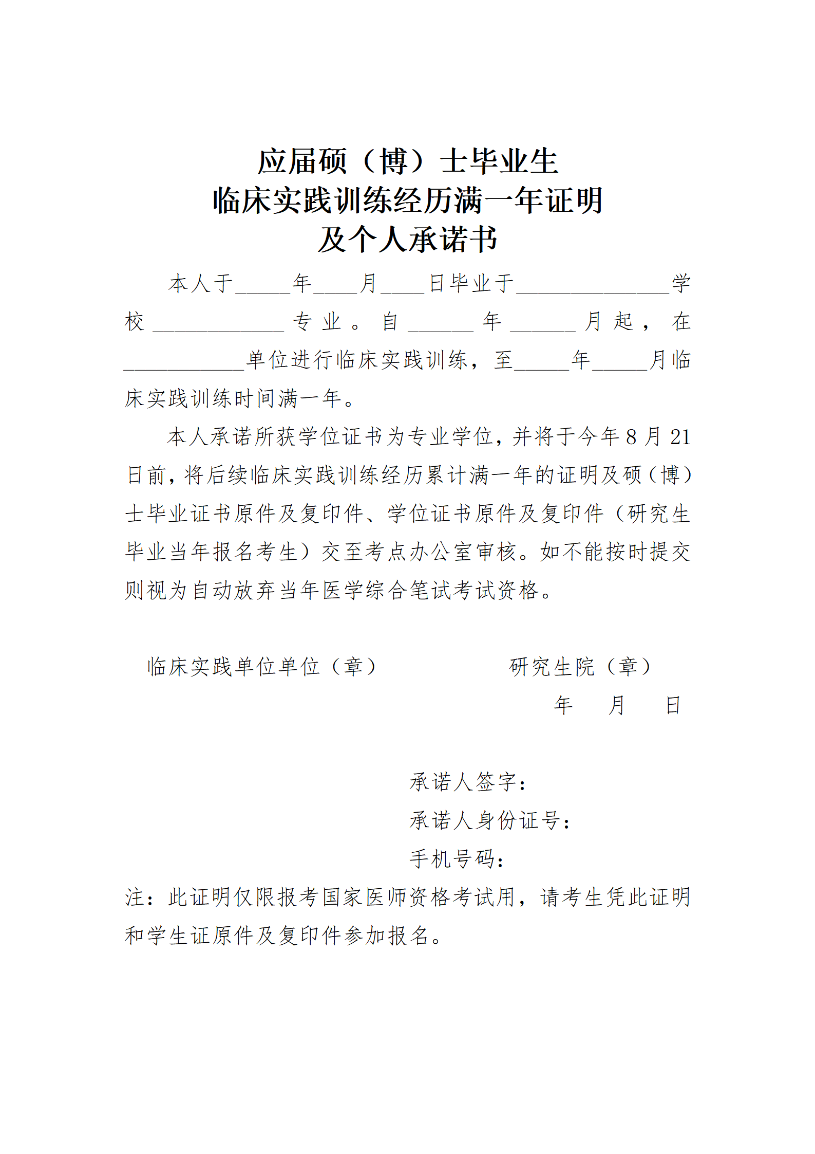 【附件下載】應屆碩(博)士畢業(yè)生臨床實踐訓練經(jīng)歷滿一年證明及個人承諾生