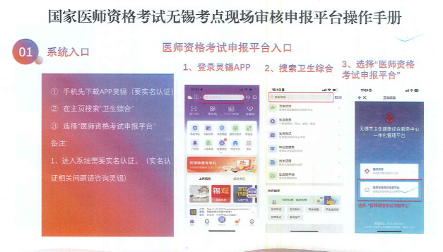 考生在國家系統(tǒng)報名完成后,應同步登錄無錫市醫(yī)師資格考試現場審核申報平臺(登錄“靈錫”--搜索并進入“衛(wèi)生綜合”)進行現場確認資料提交及預約。