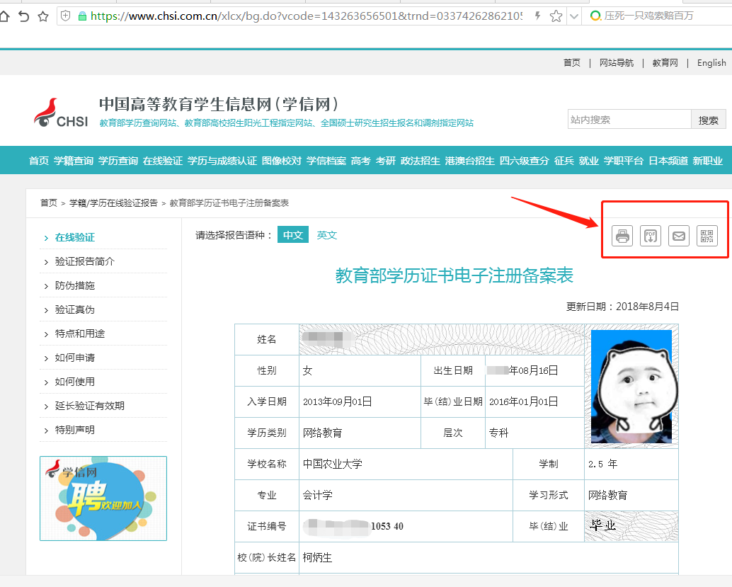 打印教育部高等教育學(xué)歷證書電子注冊備案表流程