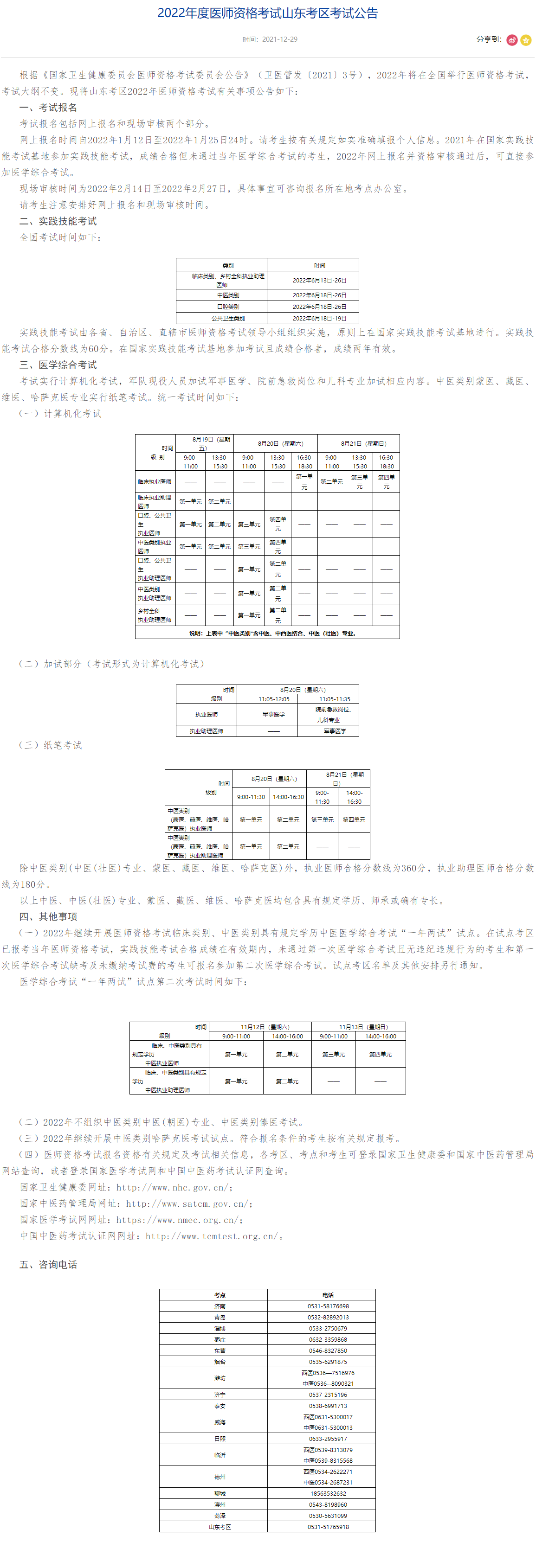 根據(jù)《國(guó)家衛(wèi)生健康委員會(huì)醫(yī)師資格考試委員會(huì)公告》(衛(wèi)醫(yī)管發(fā)〔2021〕3號(hào)),2022年將在全國(guó)舉行醫(yī)師資格考試,考試大綱不變。現(xiàn)將山東考區(qū)2022年醫(yī)師資格考試有關(guān)事項(xiàng)公告如下: