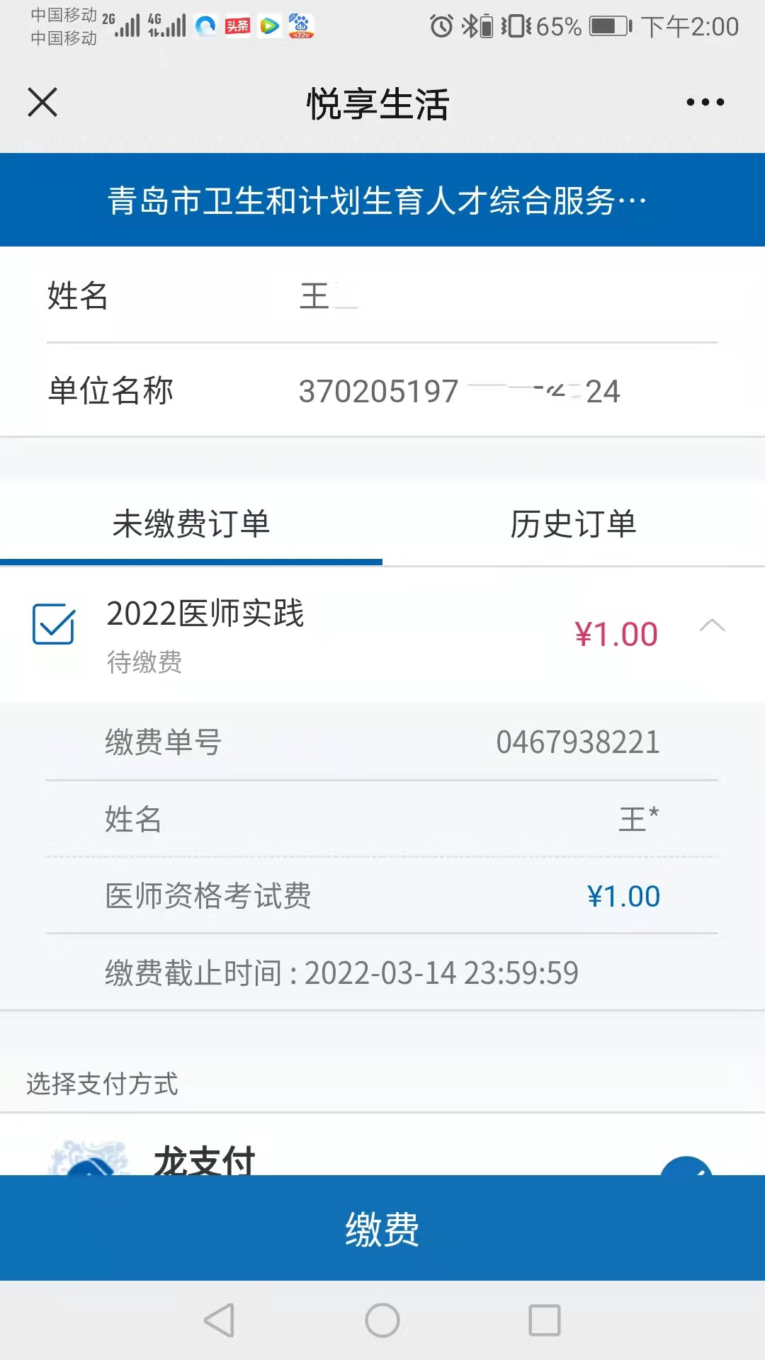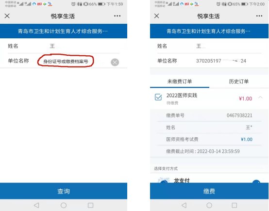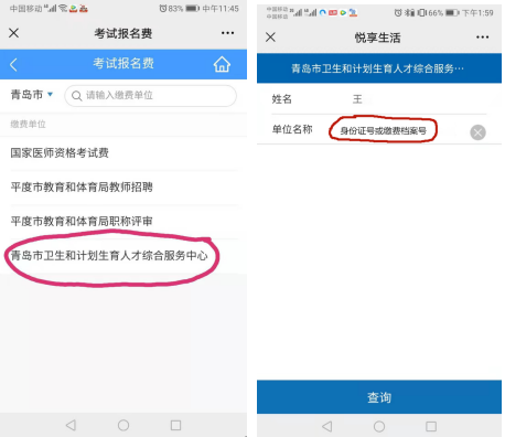 2.選擇“悅享生活”—“學校教育”—“考試報名費”—“青島市衛(wèi)生和計劃生育人才綜合服務中心”下一步— “姓名” “單位名稱”處填:“身份證號”,其他證件報考的考生請?zhí)顚憽袄U費檔案號”。