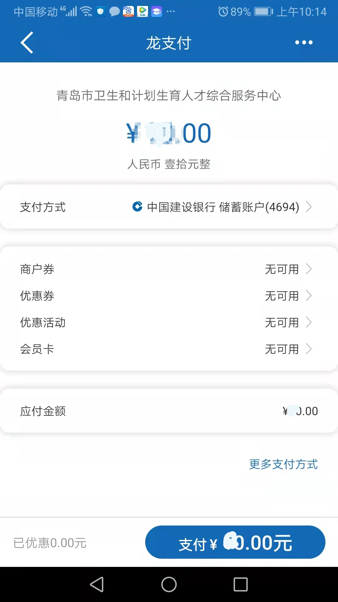 登錄建行官方網(wǎng)站悅生活平臺,選擇“悅享生活”→“悅生活”→“應用服務”→“學校教育”→“考試報名費”→“山東省-青島市-青島市衛(wèi)生和計劃生育人才綜合服務中心” →下一步→根據(jù)頁面提示, 輸入“姓名”, 輸入單位名稱“身份證號”,其他證件報考的考生請?zhí)顚憽袄U費檔案號”→下一步→核對支付信息→“確認”→輸入建行帳號等信息,完成支付。