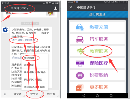 微信關(guān)注“中國建設銀行”公眾號,進入公眾號,點擊“悅生活”,再點擊“生活繳費”,在出現(xiàn)的頁面點擊“立即繳費”。根據(jù)提示完成繳費。