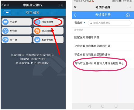 (1)找到繳費項目。登錄建行最新版手機銀行客戶端,選擇菜單欄“悅生活”→“學校教育”→“考試報名費” ,選擇“山東省 青島市” →“青島市衛(wèi)生和計劃生育人才綜合服務中心”,點擊“下一步”,