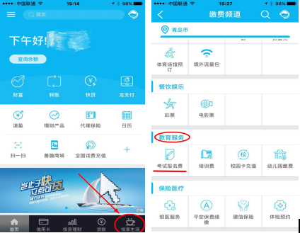 2.登錄網(wǎng)上銀行,在“悅生活”→“應用服務”→“ 學校教育”→“考試報名費”“項目下完成繳費。