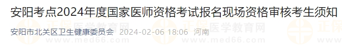 為確保廣大考生順利參加考試,根據(jù)《國家衛(wèi)生健康委員會醫(yī)師資格考試委員會公告》(2024年第2號)要求,結(jié)合我市實際,現(xiàn)將安陽考點2024年醫(yī)師資格考試考生報名現(xiàn)場資格審核有關(guān)事項明確如下: