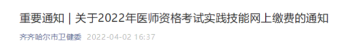 關(guān)于2022年雙鴨山考點(diǎn)醫(yī)師資格考試實(shí)踐技能網(wǎng)上繳費(fèi)的通知