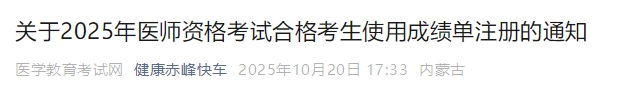 內(nèi)蒙古赤峰2025年醫(yī)師資格考試合格考生使用成績(jī)單注冊(cè)的通知