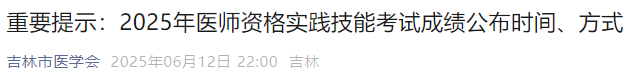 吉林市2025年醫(yī)師資格實(shí)踐技能考試成績公布方式有變更!吉林官方發(fā)布特別提醒:2025年醫(yī)師資格實(shí)踐技能考試成績考后72小時(shí)官網(wǎng)可查!請(qǐng)相關(guān)考生及時(shí)了解,考后關(guān)注成績!
