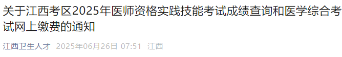 為更好服務考生、縮短考生查詢成績等待時間,根據(jù)國家醫(yī)師資格考試工作要求及我省考務工作安排,各有關考點、考試基地自6月17日起已陸續(xù)開通考試成績查詢,考生可在考試結束后48小時在所在考點或考試基地查詢。江西考區(qū)將于6月26日在國家醫(yī)學考試網開通2025年醫(yī)師資格實踐技能考試成績查詢,6月26日-7月6日將開通醫(yī)學綜合考試網上繳費。未在規(guī)定時間內完成網上繳費的考生,視為放棄報名考試,將無法打印準考證等材料,無法參加后續(xù)考試。
