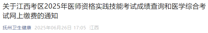 江西撫州考點2025年醫(yī)師資格實踐技能考試成績官網(wǎng)可查了!