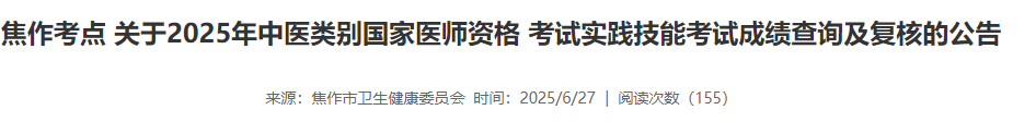 河南焦作2025年醫(yī)師資格實踐技能考試成績已公布,考生速查!