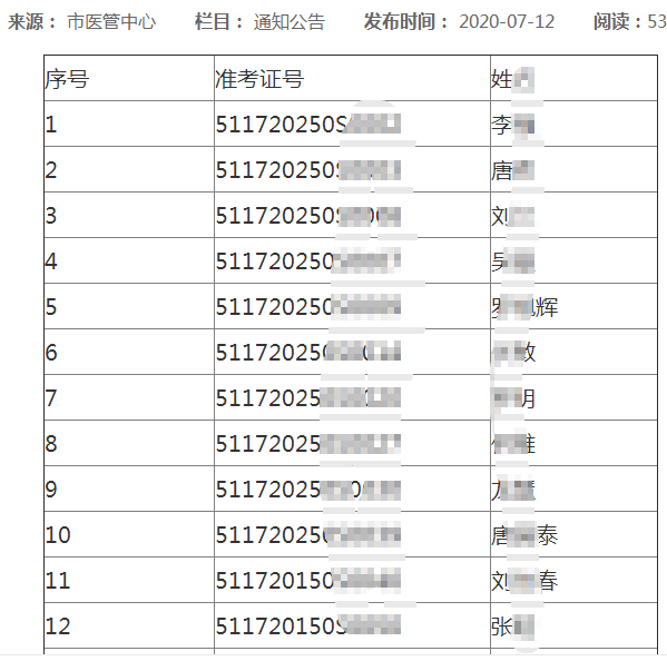 四川遂寧2020年國家醫(yī)師資格實(shí)踐技能考試中醫(yī)類7月12日不合格人員名單