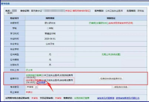 實(shí)踐技能考試結(jié)果顯示為“技能通過(guò)”或“技能免考”的考生,點(diǎn)擊“上傳相關(guān)材料”跳轉(zhuǎn)至“湖北考區(qū)醫(yī)師資格個(gè)人申報(bào)平臺(tái)”,“繳費(fèi)狀態(tài)”欄點(diǎn)“綜合筆試待繳費(fèi)”后面的“立即繳費(fèi)”按鈕,按提示完成醫(yī)學(xué)綜合筆試網(wǎng)上繳費(fèi),完成繳費(fèi)后刷新頁(yè)面核實(shí)是否繳費(fèi)成功。