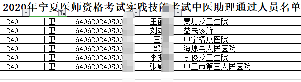 以上為部分寧夏考區(qū)2020年國家醫(yī)師資格實(shí)踐技能考試合格人員名單。完整名單信息請(qǐng)?jiān)趯幭尼t(yī)學(xué)會(huì)官方網(wǎng)站查詢。也可以直接下載附件查看。
