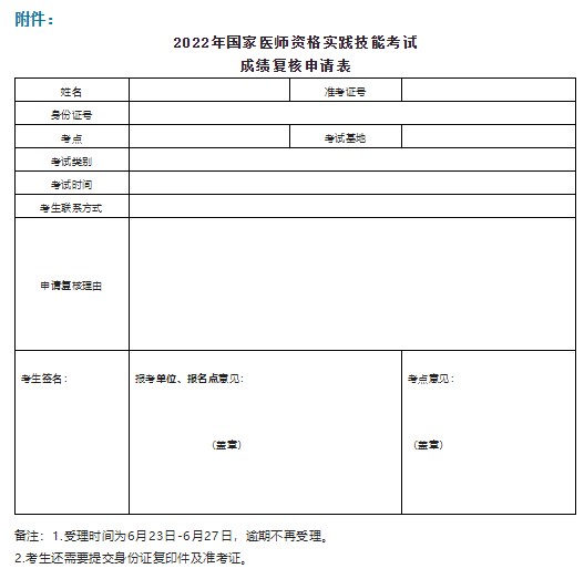 根據(jù)考試通行規(guī)則,考生可申請(qǐng)復(fù)核成績(jī)是否存在漏評(píng)、錯(cuò)統(tǒng)情況,評(píng)分寬嚴(yán)不屬于復(fù)核范圍。對(duì)于考試結(jié)果有異議、確有必要核查的,由考生填報(bào)《2022年國(guó)家醫(yī)師資格實(shí)踐技能考試成績(jī)復(fù)核申請(qǐng)表》(附件)等材料,經(jīng)所在單位和報(bào)名點(diǎn)【各縣(市、區(qū))資格審核部門】同意后報(bào)所在考點(diǎn)審批,經(jīng)考點(diǎn)審核同意后上報(bào)考區(qū)處理。受理時(shí)間為6月23日-6月27日,逾期不再受理。具體咨詢吉安市醫(yī)考辦,聯(lián)系電話:0796-8216766,0796-8224333。
