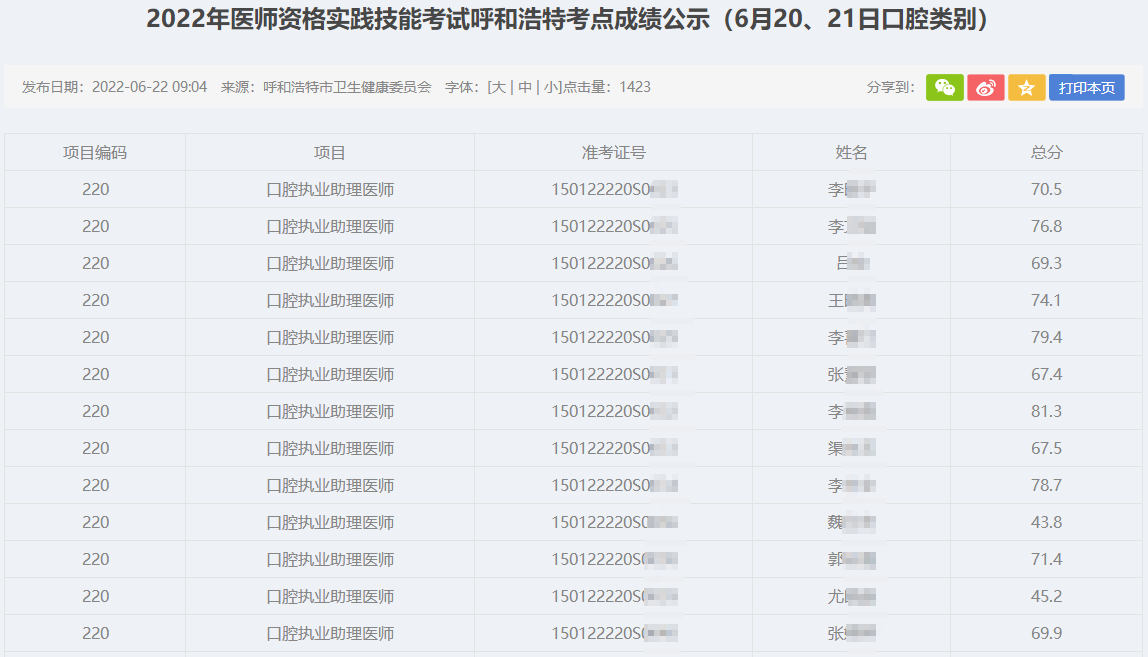 2022年醫(yī)師資格實踐技能考試呼和浩特考點成績公示(6月20、21日口腔類別)