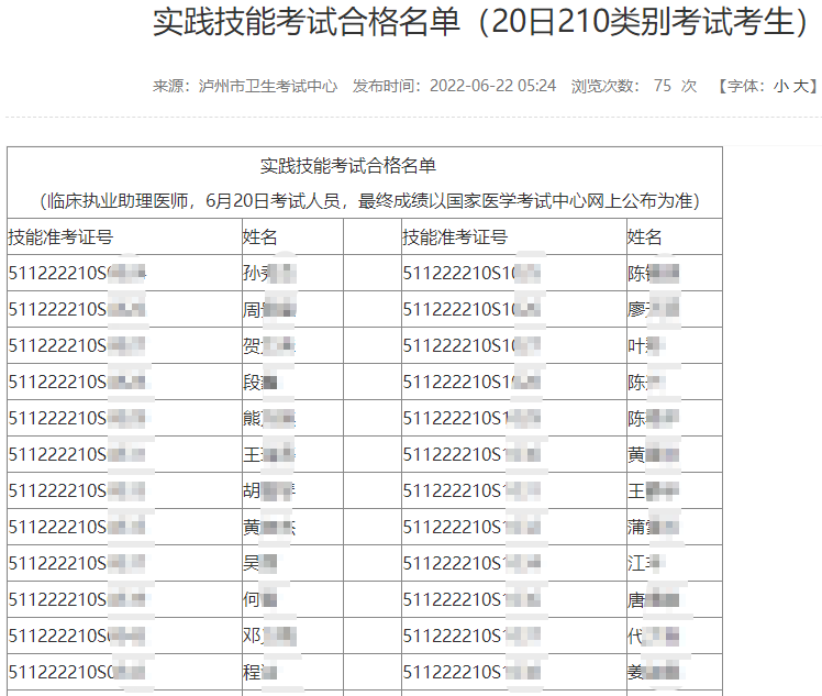 瀘州市2022年醫(yī)師實(shí)踐技能考試合格名單(20日210類(lèi)別考試考生)