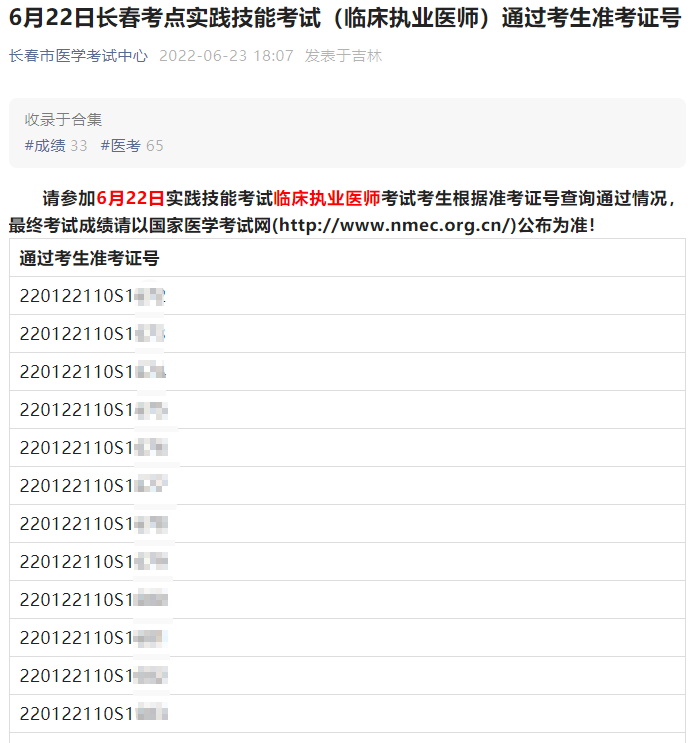 6月22日長(zhǎng)春考點(diǎn)實(shí)踐技能考試(臨床執(zhí)業(yè)醫(yī)師)通過(guò)考生準(zhǔn)考證號(hào)