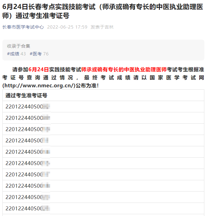 6月24日長(zhǎng)春考點(diǎn)實(shí)踐技能考試(師承或確有專長(zhǎng)的中醫(yī)執(zhí)業(yè)助理醫(yī)師)通過考生準(zhǔn)考證號(hào)!請(qǐng)參加6月24日實(shí)踐技能考試師承或確有專長(zhǎng)的中醫(yī)執(zhí)業(yè)助理醫(yī)師考試考生根據(jù)準(zhǔn)考證號(hào)查詢通過情況,最終考試成績(jī)請(qǐng)以國(guó)家醫(yī)學(xué)考試網(wǎng)()公布為準(zhǔn)!
