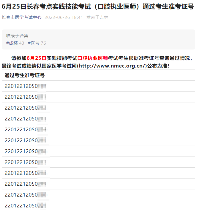 6月25日長春考點實踐技能考試(口腔執(zhí)業(yè)醫(yī)師)通過考生準考證號!