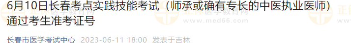 請參加6月10日長春考點實踐技能考試師承或確有專長的中醫(yī)執(zhí)業(yè)醫(yī)師的考生根據(jù)準考證號查詢考試通過情況,最終考試成績以國家醫(yī)學(xué)考試網(wǎng)()公布為準!