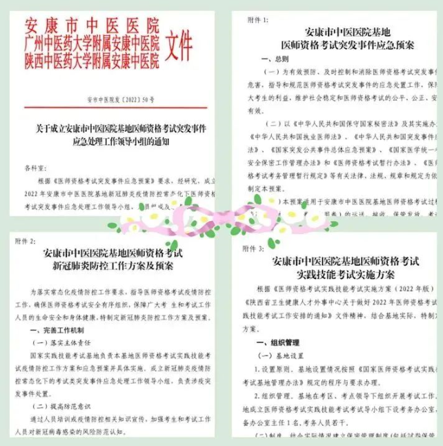 在新冠肺炎疫情防控的特殊形勢(shì)下,成立了安康市中醫(yī)醫(yī)院基地醫(yī)師資格考試突發(fā)事件應(yīng)急處理工作領(lǐng)導(dǎo)小組,制定了《安康市中醫(yī)醫(yī)院基地2022年醫(yī)師資格考試實(shí)踐技能考試突發(fā)事件應(yīng)急預(yù)案》、《安康市中醫(yī)醫(yī)院基地2022年醫(yī)師資格考試實(shí)踐技能考試新冠肺炎疫情防控工作方案及預(yù)案》及《安康市中醫(yī)醫(yī)院基地醫(yī)師資格考試實(shí)踐技能考試實(shí)施方案》,統(tǒng)籌安排協(xié)調(diào)考試各項(xiàng)工作,嚴(yán)格落實(shí)國家疫情防控工作要求??荚嚻陂g,考務(wù)人員每天早上7:00到位,7:20考生進(jìn)站檢錄,對(duì)所有進(jìn)入基地的考生、考試工作人員進(jìn)行體溫檢測(cè)、核查健康碼、行程碼、48小時(shí)核酸檢測(cè)報(bào)告及相關(guān)身份信息,收取考生健康承諾書和體溫檢測(cè)表。除按考試要求嚴(yán)格執(zhí)考外,在疫情防控常態(tài)化的形勢(shì)下,積極、嚴(yán)格做好各項(xiàng)防疫工作。每兩天對(duì)考官和考務(wù)工作人員進(jìn)行一次核酸檢測(cè),每場(chǎng)考完結(jié)束指定專人對(duì)考試相關(guān)場(chǎng)所進(jìn)行消毒,把疫情防控工作做細(xì)做實(shí)。