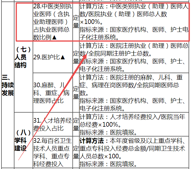 考核指標(biāo)28項(xiàng):中醫(yī)類別執(zhí)業(yè)醫(yī)師(含執(zhí)業(yè)助理醫(yī)師)占執(zhí)業(yè)醫(yī)師總數(shù)比例,計(jì)算方法:中醫(yī)類別執(zhí)業(yè)(助理)醫(yī)師人數(shù)/醫(yī)院執(zhí)業(yè)(助理)醫(yī)師總?cè)藬?shù)×100%。