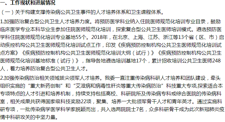 2.繼續(xù)推動(dòng)《深化公立醫(yī)院薪酬制度改革的指導(dǎo)意見》出臺(tái),并會(huì)同相關(guān)部門推動(dòng)落實(shí),指導(dǎo)做好組織實(shí)施。繼續(xù)積極協(xié)調(diào)財(cái)政部結(jié)合醫(yī)學(xué)人才培養(yǎng)特點(diǎn),進(jìn)一步加大對(duì)醫(yī)學(xué)教育的投入力度,研究將傳染病防治人才培養(yǎng)納入衛(wèi)生健康人才培養(yǎng)項(xiàng)目,推進(jìn)傳染病防治人才培養(yǎng)體系建設(shè),不斷提高傳染病人才的數(shù)量與質(zhì)量。