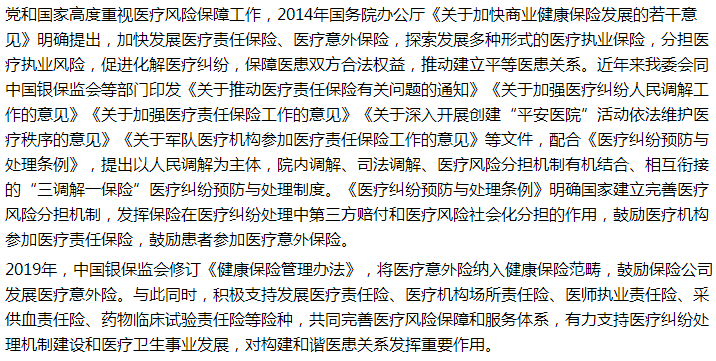 (二)繼續(xù)推進(jìn)產(chǎn)品創(chuàng)新與服務(wù)創(chuàng)新。我委將會同中國銀保監(jiān)會等部門結(jié)合醫(yī)療事業(yè)發(fā)展、醫(yī)療技術(shù)進(jìn)步、醫(yī)院管理水平和各地醫(yī)患矛盾實(shí)際情況,開發(fā)有針對性的保險(xiǎn)產(chǎn)品,分擔(dān)醫(yī)療機(jī)構(gòu)在滿足群眾日益增長的健康需求過程中面臨的風(fēng)險(xiǎn),緩解醫(yī)療機(jī)構(gòu)經(jīng)濟(jì)責(zé)任和社會壓力,調(diào)動醫(yī)務(wù)人員積極性,增強(qiáng)患者醫(yī)療風(fēng)險(xiǎn)意識,構(gòu)建和諧醫(yī)患關(guān)系,維護(hù)社會穩(wěn)定,推進(jìn)醫(yī)療衛(wèi)生事業(yè)健康發(fā)展。