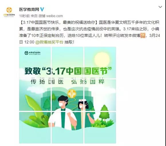 2020年3月17日--2020年3月23日期間,關(guān)注“醫(yī)學(xué)教育網(wǎng)”微博,轉(zhuǎn)發(fā)“中國(guó)國(guó)醫(yī)節(jié)活動(dòng)帖”并評(píng)論,同樣是2020年3月24日,小編會(huì)隨機(jī)抽出10名幸運(yùn)考友,每人免費(fèi)送正保定制版臺(tái)歷一個(gè)。