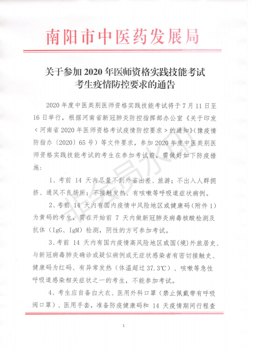 河南省南陽市關(guān)于參加2020年醫(yī)師資格實踐技能考試考生疫情防控要求的通告