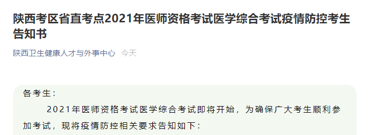 陜西考區(qū)省直考點(diǎn)2021年醫(yī)師資格考試醫(yī)學(xué)綜合考試疫情防控考生告知書