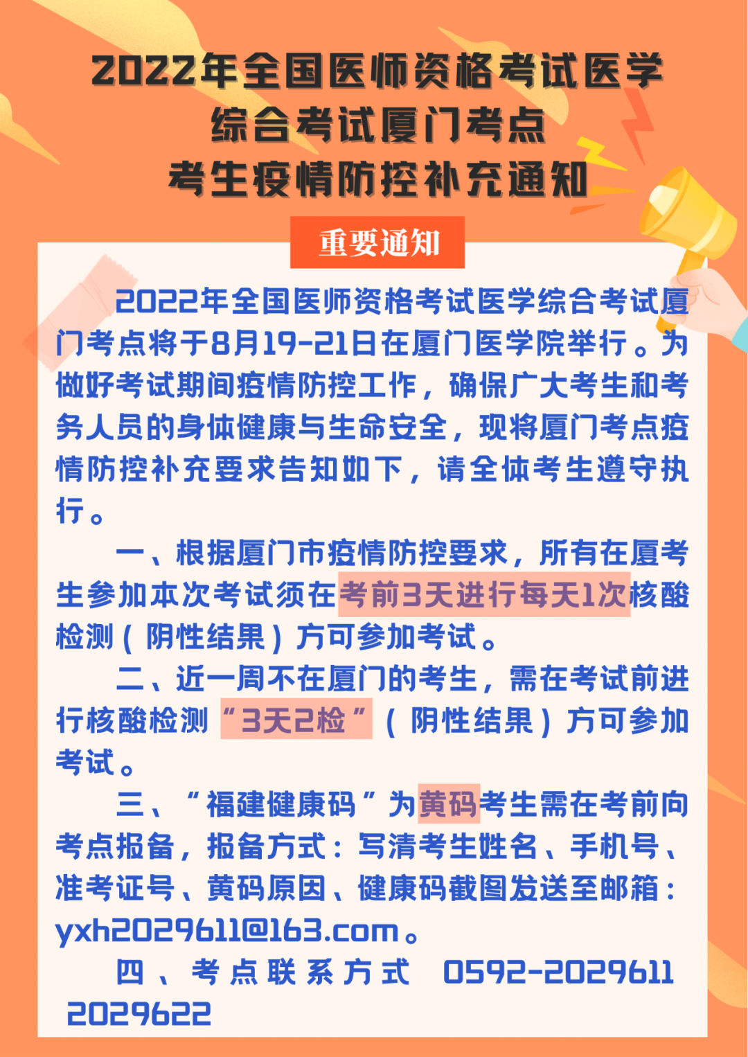 2022年全國醫(yī)師資格考試醫(yī)學(xué)綜合考試廈門考點考生疫情防控補充通知