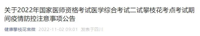 關(guān)于2022年國家醫(yī)師資格考試醫(yī)學綜合考試二試攀枝花考點考試期間疫情防控注意事項公告