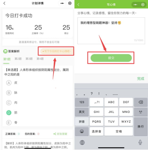 做完題后,可以查看每道題的解析和整體做題情況,然后點擊“分享今日打卡心情”,輸入您要記錄的內(nèi)容,提交即可完成打卡。