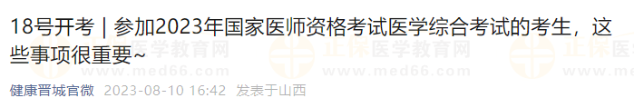 山西省晉城市2023年國家醫(yī)師資格考試醫(yī)學綜合考試考前注意事項已發(fā)布!參加2023年國家醫(yī)師資格考試醫(yī)學綜合考試的考生,這些事項很重要,請各位考生認真閱讀: