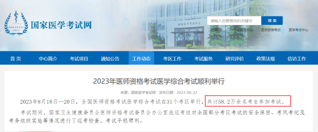 近日,國(guó)家醫(yī)學(xué)考試網(wǎng)公布,2023全國(guó)醫(yī)師資格考試醫(yī)學(xué)綜合考試在31個(gè)考區(qū)舉行,共計(jì)58.2萬(wàn)余名考生參加考試。