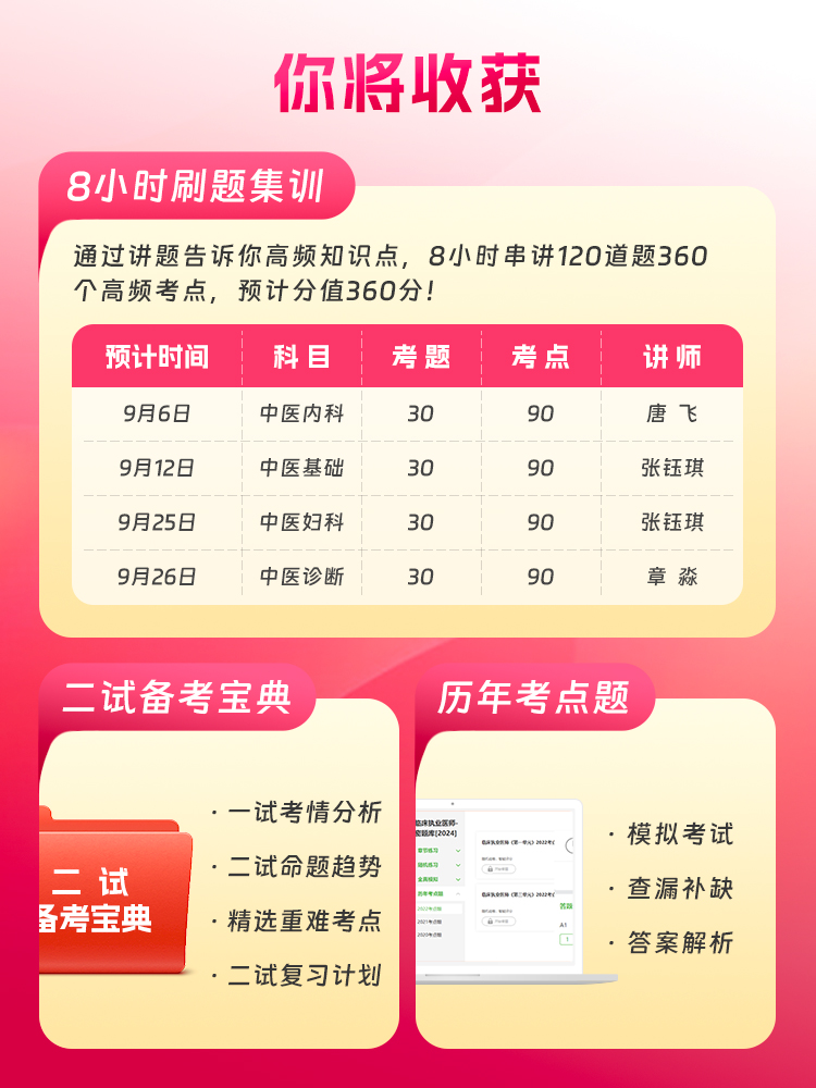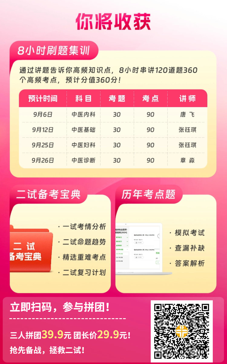 - · 2024臨床|中醫(yī)醫(yī)師【二試考點(diǎn)絕殺課】上線(xiàn),今年過(guò)線(xiàn)最后機(jī)會(huì)!