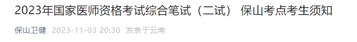 2023年國家醫(yī)師資格考試綜合筆試(二試)將于11月11日起統(tǒng)一舉行,為保障考生順利參加考試,現(xiàn)將保山考點具體安排告知如下,請全體考生遵照執(zhí)行。