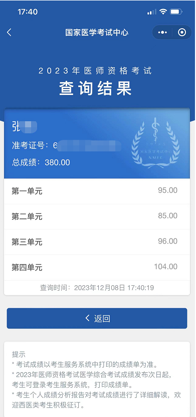 12.08號查的分,執(zhí)業(yè)380分…不敢相信自己能過,查分的時候手都在抖。我終于考上執(zhí)業(yè)啦!除了開心唯一的感覺就是今后的日子有盼頭了!從2015年的助理醫(yī)到2023的執(zhí)業(yè)醫(yī),這段路我走了整整八年,很艱辛,很難…還好沒放棄,堅持了下來。青春能有幾個8年…