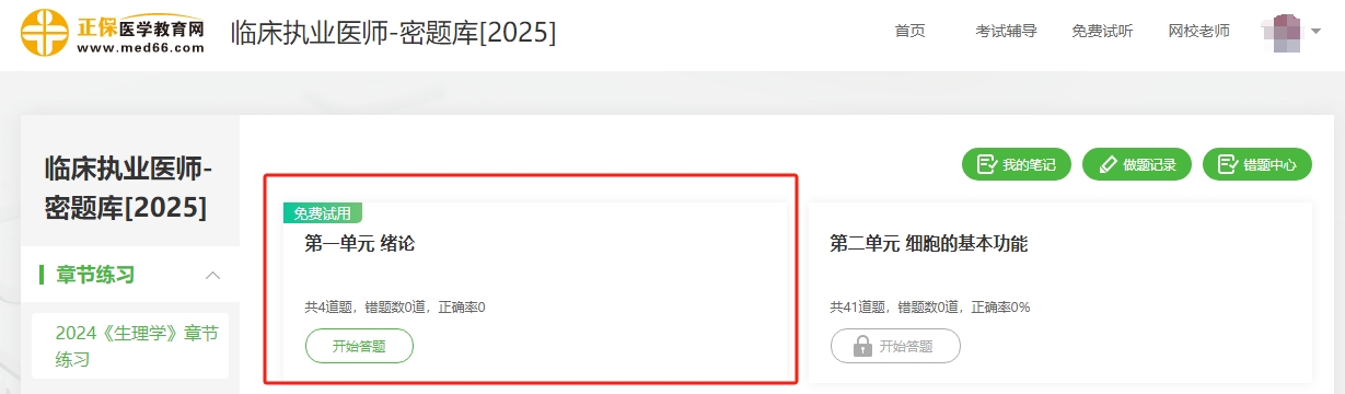 示例:例如選擇【臨床執(zhí)業(yè)】科目-【章節(jié)練習(xí)】-【《生理學(xué)》章節(jié)練習(xí)】-【第一單元緒論】已開通免費試用供大家體驗。