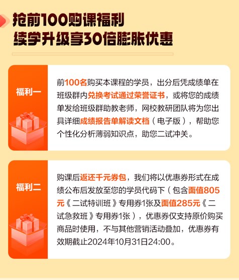 購(gòu)買《二試考點(diǎn)絕殺課》的學(xué)員,更將解鎖驚喜:30倍返還千元券包(一試出分后發(fā)放),可以用于復(fù)購(gòu)臨床|中醫(yī)《二試考前急救班》以及臨床《二試特訓(xùn)班》。