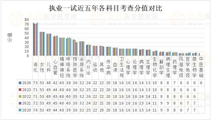二、臨床執(zhí)業(yè)醫(yī)師近5年各科目考查分值對比