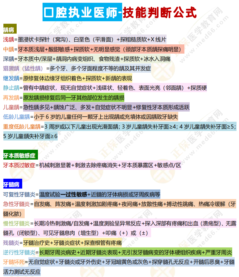 《口腔醫(yī)師技能判斷公式多色筆記》通過多色標(biāo)注,清晰地展示了各類疾病的判斷公式和操作要點(diǎn),幫助考生快速掌握關(guān)鍵知識(shí)點(diǎn)。