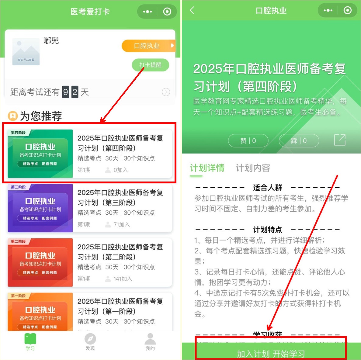 請(qǐng)選擇“您的備考計(jì)劃”,如口腔執(zhí)業(yè)醫(yī)師備考復(fù)習(xí)計(jì)劃(第四階段),然后點(diǎn)擊下方“加入計(jì)劃開始學(xué)習(xí)”按鈕,開始正式進(jìn)入打卡學(xué)習(xí);