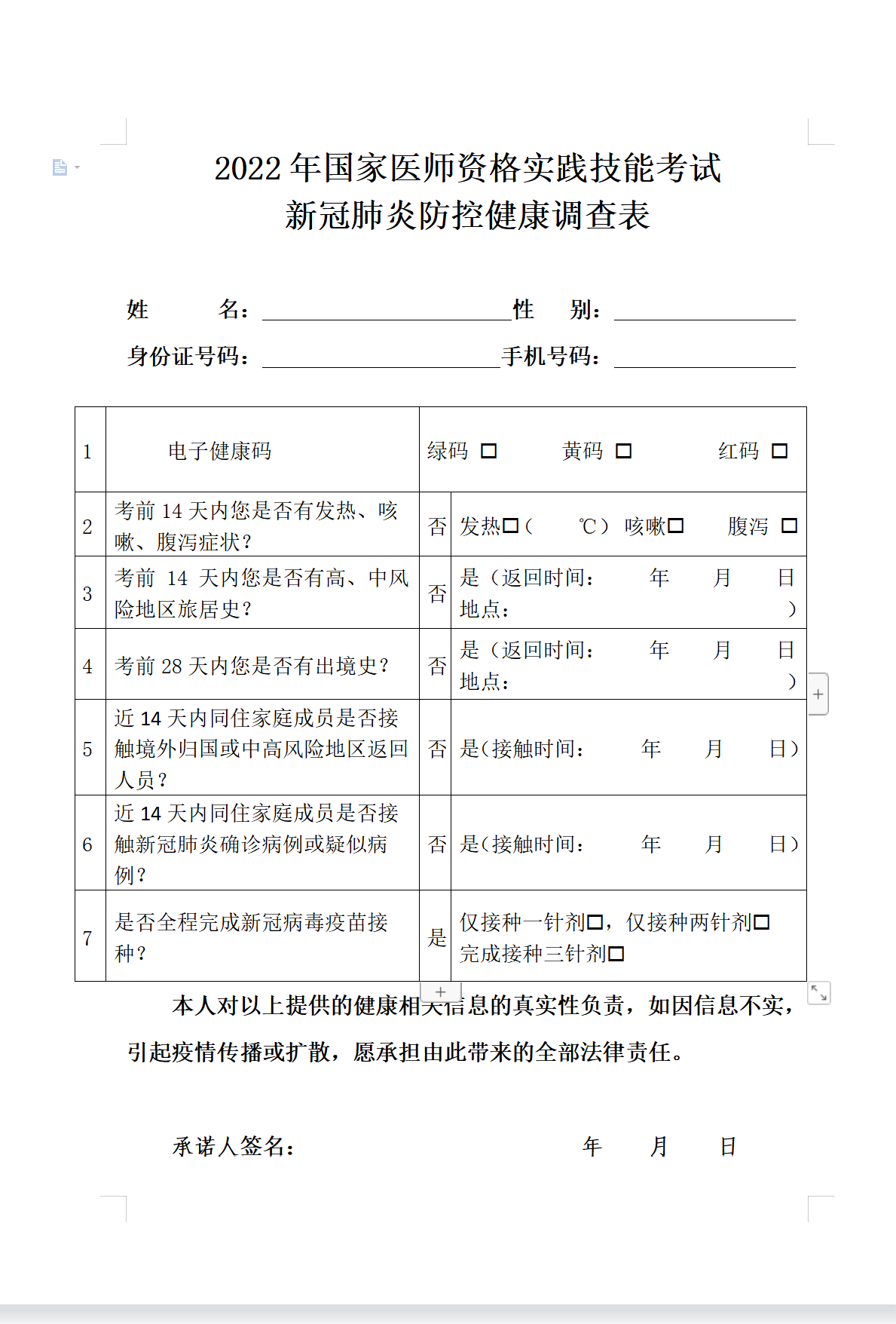 湖南考區(qū)2022年國(guó)家醫(yī)師資格實(shí)踐技能考試新冠肺炎防控健康調(diào)查表