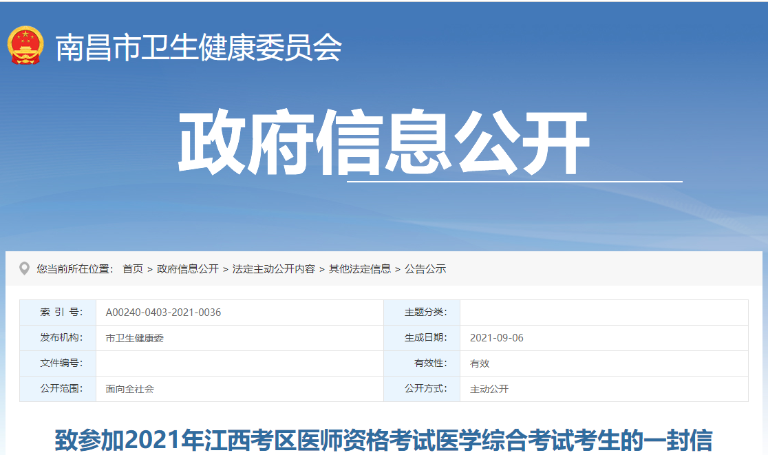 江西考區(qū)南昌考點(diǎn)的衛(wèi)健委轉(zhuǎn)發(fā)了致參加2021年江西考區(qū)醫(yī)師資格考試醫(yī)學(xué)綜合考試考生的一封信,相信這是廣大考生們關(guān)注的事情,醫(yī)學(xué)教育網(wǎng)小編整理官方公告如下: