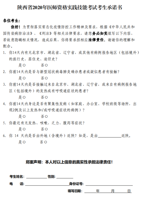 陜西省2020年醫(yī)師資格考試實(shí)踐技能考試考生承諾書